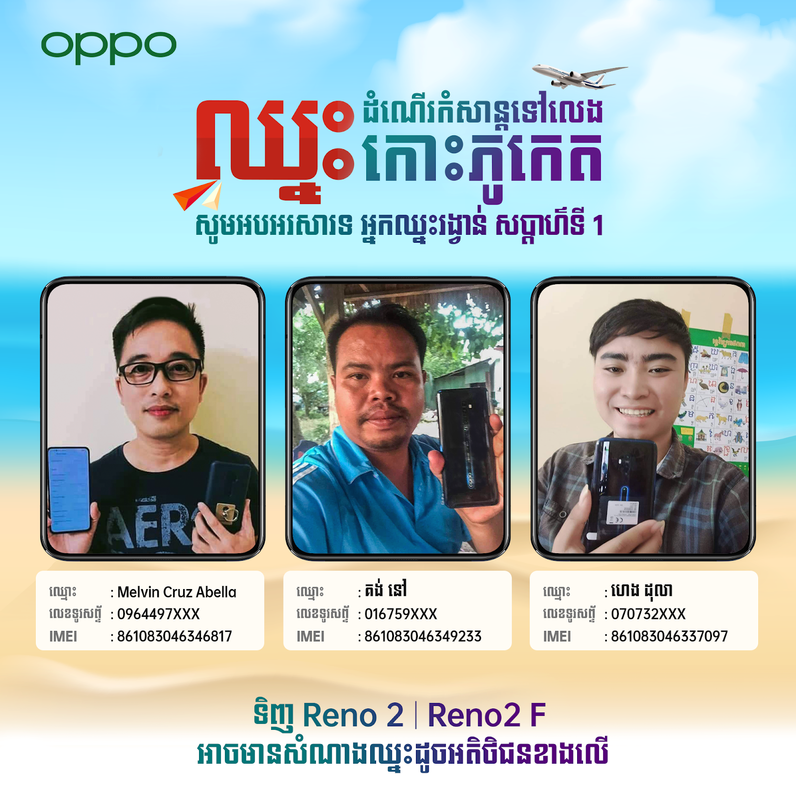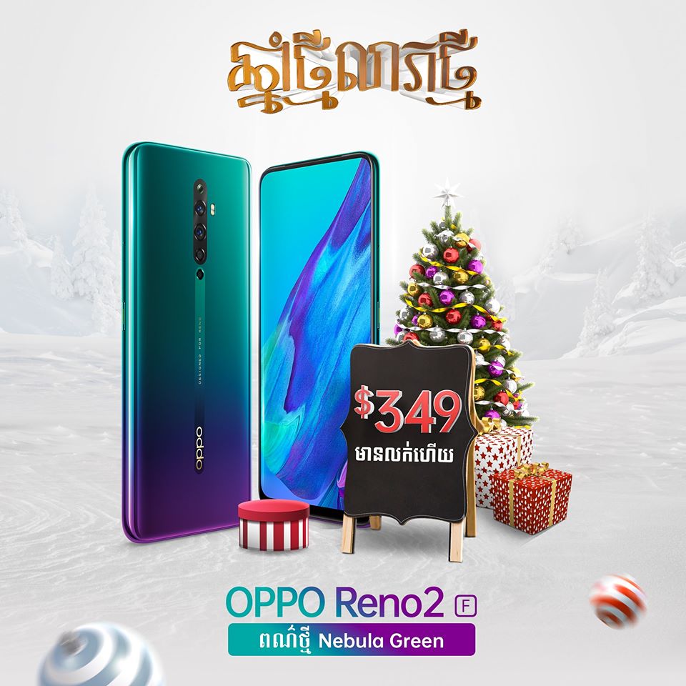 សូមរំលឹកថា ដើម្បីអបអរសាទរបុណ្យ Christmas ឆ្លងឆ្នាំសកល និងជាពិសេសថ្លែងអំណរអរគុណអតិថិជន ចំពោះការគាំទ្រ រហូតជម្រុញឲ្យ OPPO ឈរលើចំណាត់ថ្នាក់លេខ១ នៅកម្ពុជា ក្រុមហ៊ុនទូរស័ព្ទដៃ OPPO ផ្តល់កាដូថ្មី តម្លៃពិសេសថ្មី និងរង្វាន់ធំទៅលេងកោះភូកេតជាច្រើនសរុប 39 រង្វាន់ ដល់អតិថិជន OPPO Reno2 F (តម្លៃថ្មី $349) និង OPPO Reno2 (តម្លៃ $599)។