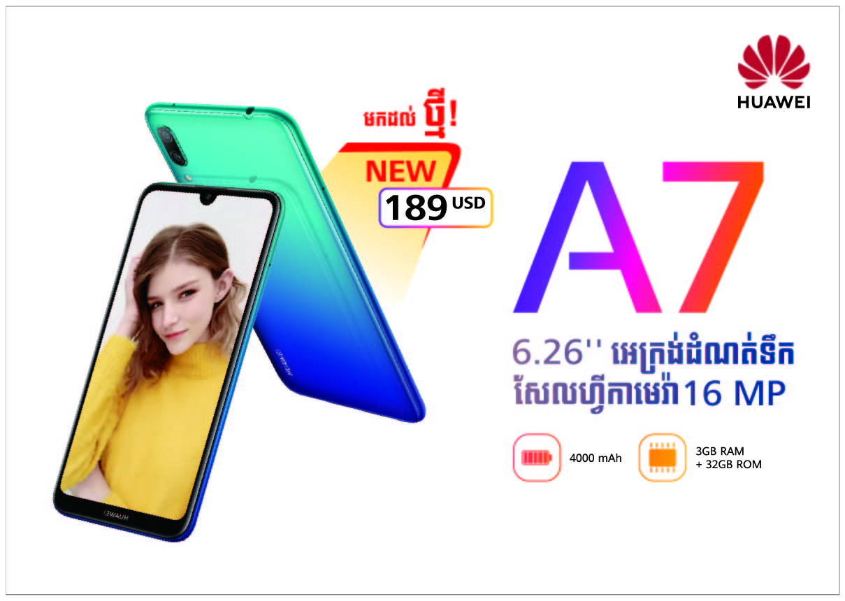 ក្រុមហ៊ុន Huawei ដែលជាក្រុមហ៊ុនស្មាតហ្វូនឈានមុខ លំដាប់លេខ 2 ក្នុងពិភពលោក បានបង្ហាញវត្តមានស្មាតហ្វូន Huawei អេ 7 នៅក្នុងទីផ្សារស្មាតហ្វូនប្រទេសកម្ពុជា ក្នុងតម្លៃត្រឹមតែ $189 ដែលស្មាតហ្វូននេះជាជម្រើសដ៏ល្អឥតខ្ចោះប្រចាំឆ្នាំសម្រាប់ស្មាតហ្វូនលំដាប់ថវិកា។