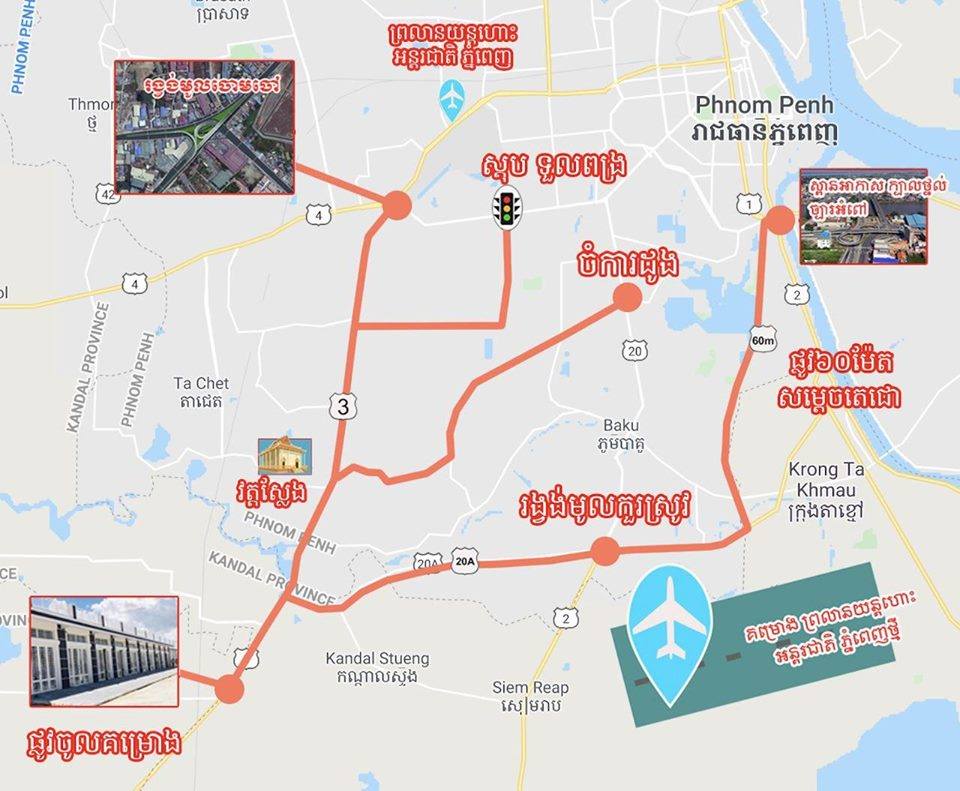 -ជម្រើសទី4.ចេញពីស្តុបទួលពង្រតាមផ្លូវ50ម៉ែត្រកាត់បុរីសន្តិភាព2ដល់ផ្លូវជាតិលេខបីបត់ឆ្វេង តាម បណ្ដោយផ្លូវជាតិលេខបីរហូតដល់បង្កោលគីឡូលេខ26។