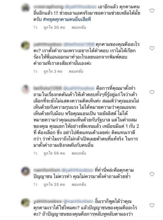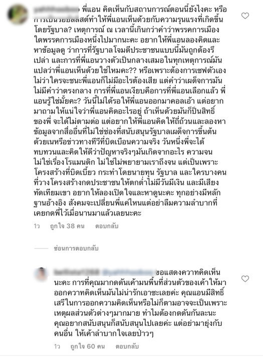 ជាក់ស្ដែង តារាសម្ដែងនិងអ្នកដឹកនាំរឿង Ann Thongprasom ដែលទើបតែមានអ្នកលេងបណ្ដាញសង្គមចូលទៅ comment នៅក្នុង IG របស់នាងទាក់ទងនិងការទាមទារឲ្យនាងចេញមកបញ្ចេញមតិយោបល់ចំពោះរឿងនេះដូចជា