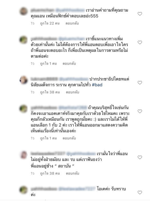 ជាក់ស្ដែង តារាសម្ដែងនិងអ្នកដឹកនាំរឿង Ann Thongprasom ដែលទើបតែមានអ្នកលេងបណ្ដាញសង្គមចូលទៅ comment នៅក្នុង IG របស់នាងទាក់ទងនិងការទាមទារឲ្យនាងចេញមកបញ្ចេញមតិយោបល់ចំពោះរឿងនេះដូចជា