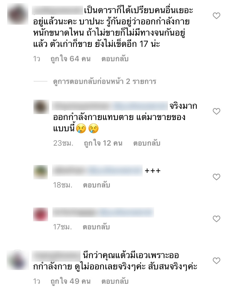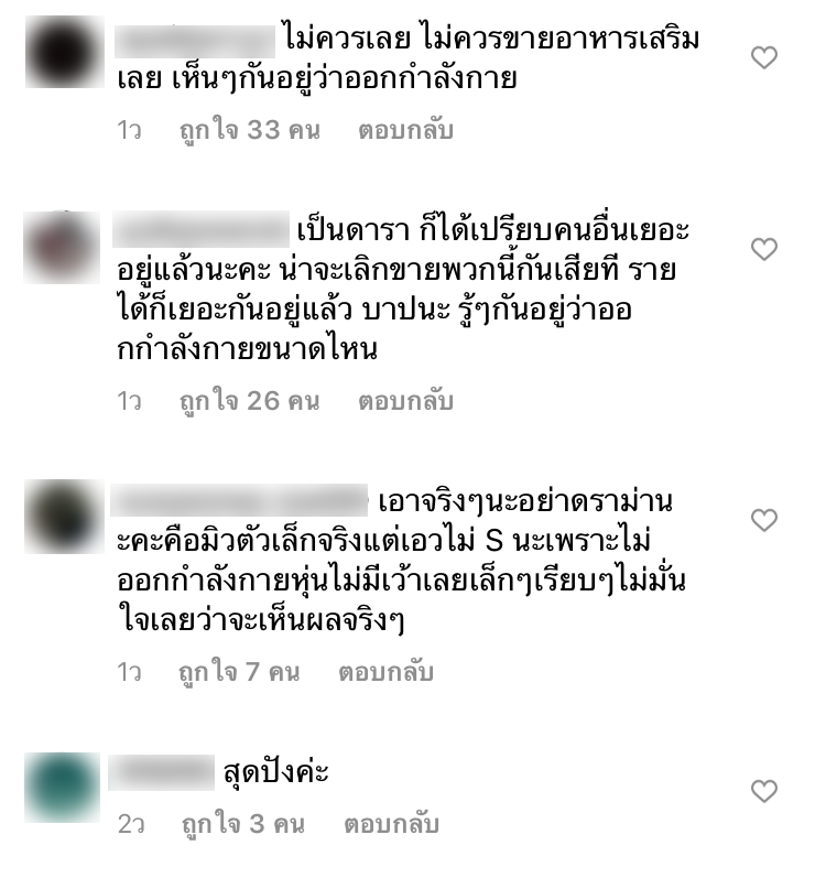 ពីការផ្សព្វផ្សាយខាងលើ ធ្វើអោយមានមនុស្សជាច្រើនមានអារម្មណ៍ថាមិនយល់ស្របជាមួយនិងការលក់អាហារបំប៉នហើយមានប្រាប់ទៀតថា អាថ៌កំបាំងនៃការមានចង្កេះកើតឡើងពីការហាត់ប្រាណ ជាពិសេស Taew ដែលលះបង់ក្នុងការហាត់ប្រាណយ៉ាងខ្លាំងរហូតទទួលបានរូបរាងស្អាតដូចដែលបានឃើញ អ្នកខ្លះទៀតបើកកកាយថា ស្មានថាចង្កេះដែលបានឃើញនិងកើតឡើងពីការហាត់ប្រាណតើ វល់ៗអស់ហើយ ខំហាត់ប្រាណជិតងាប់ ចុងក្រោយមកលក់អីបែបនេះ មិនគួណាមកលក់អាហារបំប៉នទេ ខ្លះក៏ប្រាប់ថាបាបណាស់ ព្រោះគ្រប់គ្នាក៏ឃើញស្រាប់ហើយថាការហាត់ប្រាណថ្នាក់ណា ជាតារាបានផ្លាស់ប្ដូរអ្នកផ្សេងស្រាប់ទៅហើយ គួតែបញ្ឍប់ការលក់បែបនេះទៅ